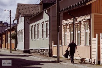 Tupakkatehtaan takaa löysimme viehättävän vanhan puutaloalueen, josta on myös saanut alkunsa Halpa-Halli-ketju. Talojen seiniin oli kiinnitetty laattoja, joissa kerrottiin kulloisenkin talon historia, niissä olikin hauskoja tarinoita mm. Pietarsaaressa on asunut Suomen ensimmäinen ammattilaisvalokuvaaja.